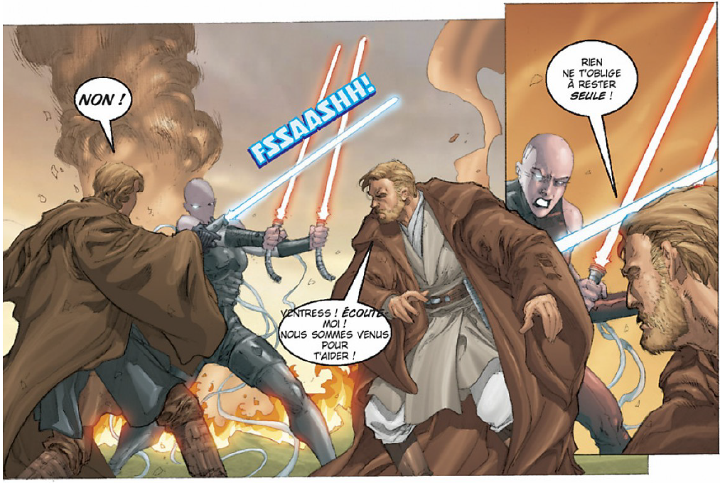 — Non ! crie Obi-Wan. Anakin, qu’est-ce que tu as fait… sa voix s’éteint lorsqu’il remarque le morceau de métal effilé que Ventress tient et qu’elle lui aurait planté en plein cœur sans l’intervention salutaire d’Anakin.