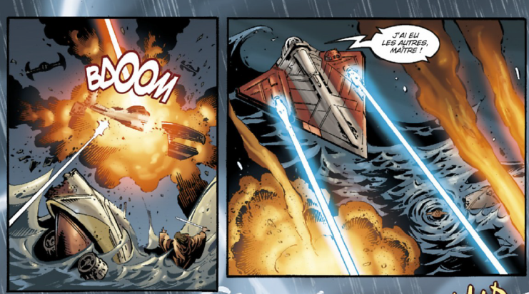 Obi-Wan se redresse et attrape son sabre laser au moment même où il aperçoit briller le fond du canon. Et le tir part. Mais avant qu’il ne puisse faire le moindre geste pour se défendre, un engin volant fonce vers lui. C’est Anakin ! Qui s’est libéré – il ne sait comment – et vient d’arriver juste au bon moment. D’un bond aidé par la Force, Obi-Wan atterri sur l’engin et Anakin remet les gaz pour s’éloigner.
